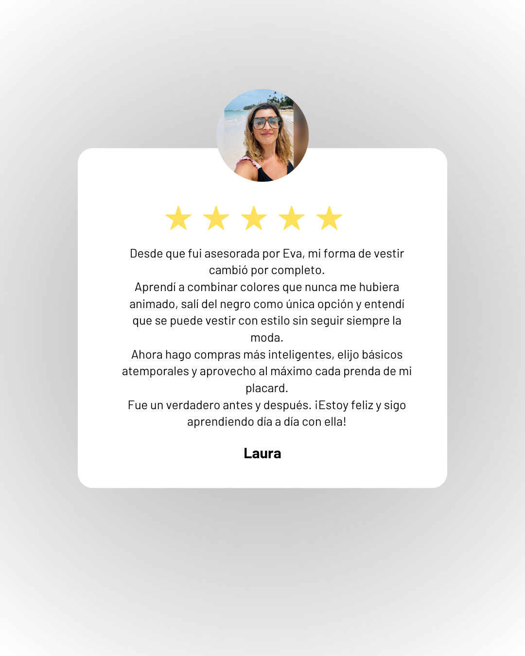 Es un proceso personalizado en el que trabajamos juntas para que tu imagen refleje quién sos hoy. No se trata solo de ropa, sino de descubrir tu estilo, aprender a elegir los colores que más te favorecen y armar looks prácticos, modernos y auténticos.